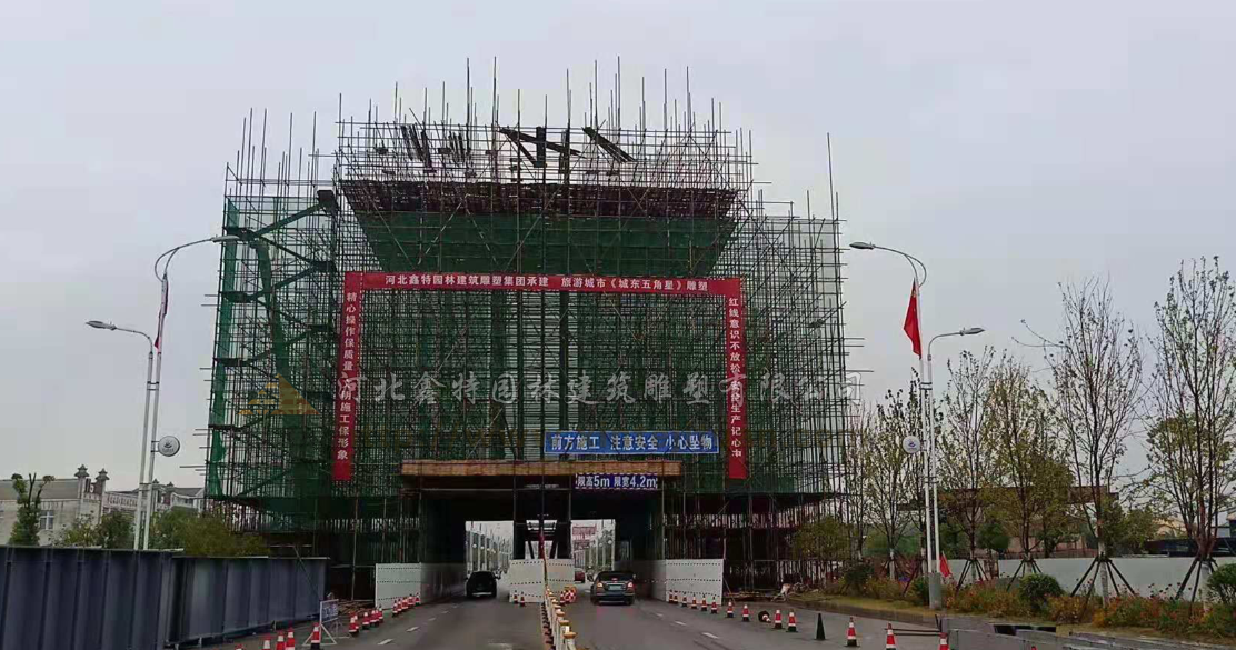雕塑位于江西省瑞金市叶坪景区,横跨苏维埃大道,因为苏维埃大道是省道,车流量比较大,施工时我们还要保证正常的通车,所以在制作安装时遇到的困难非常多。而且五角星斜度大。我们要保证非常精准的斜度才能让左右两部分在最上面连接起来。公司也是克服种种困难,最后顺利将这个大型不锈钢红色五角星雕塑制作完成。