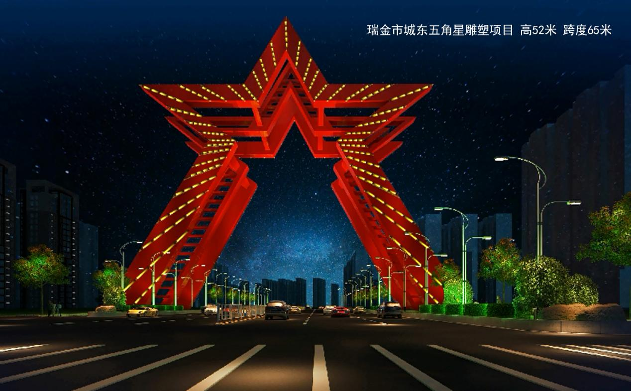该雕塑高52米,横跨苏维埃大道,侧面宽度24米,由3组钢构五角星组成,内部采用钢结构,表面采用不锈钢板喷汽车漆,设计灵感取自于苏维埃共和国国徽,高大的五角星雕塑寓意着瑞金这块红土地永放光芒,也体现着新时代红都儿女永远热爱党、永远跟党走的红心,更展现了红都儿女朝气蓬勃的精神风貌。不锈钢五角星雕塑是目前世界上最大的。