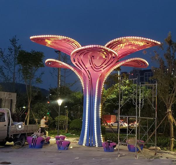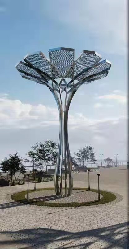 不锈钢树雕塑一般以抽象的形式出现,通过这种抽象的不锈钢树,倡导保护生态以及人与自然之间和谐的相互关系,保护人类和自然共享美丽的都市生活。