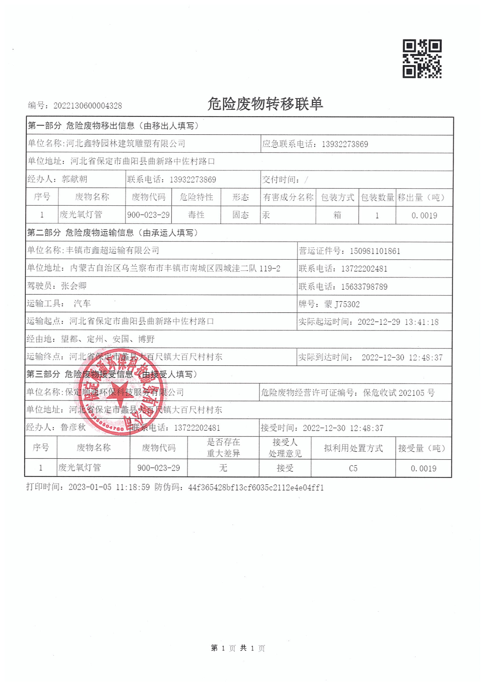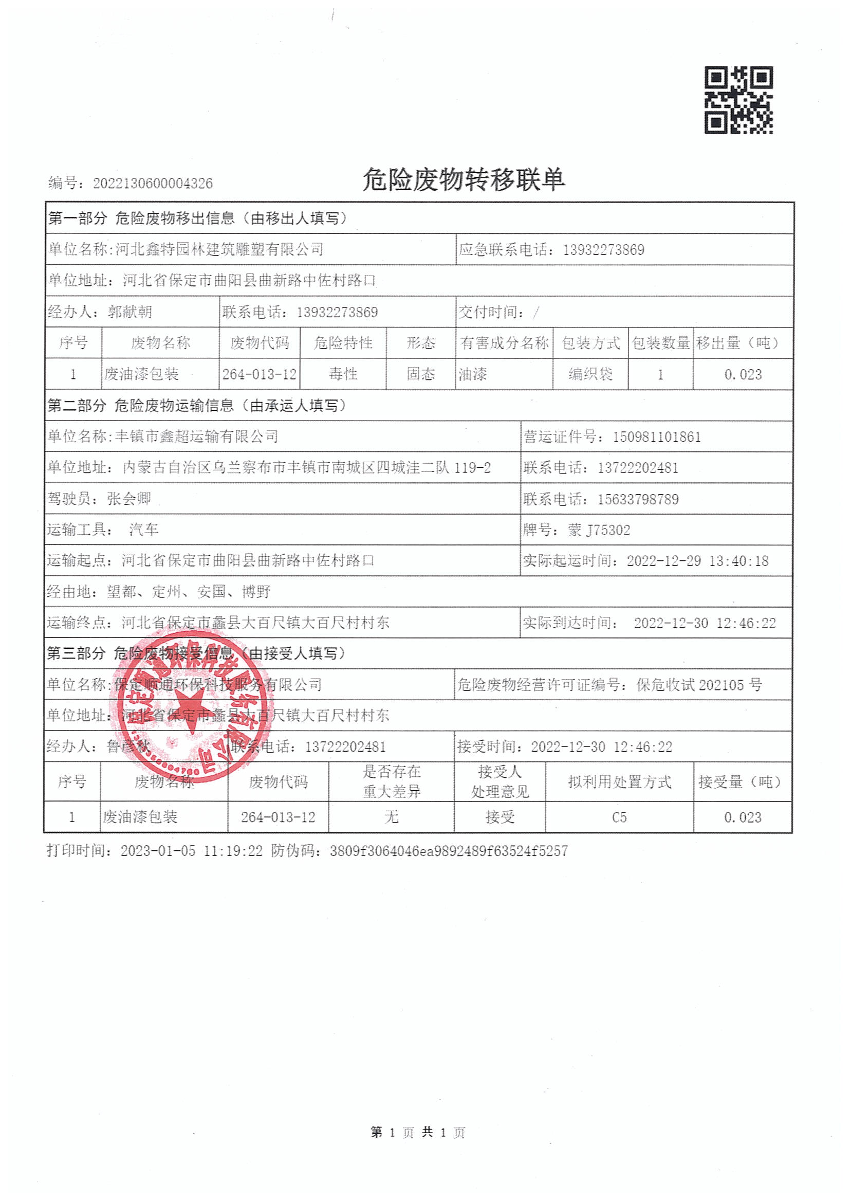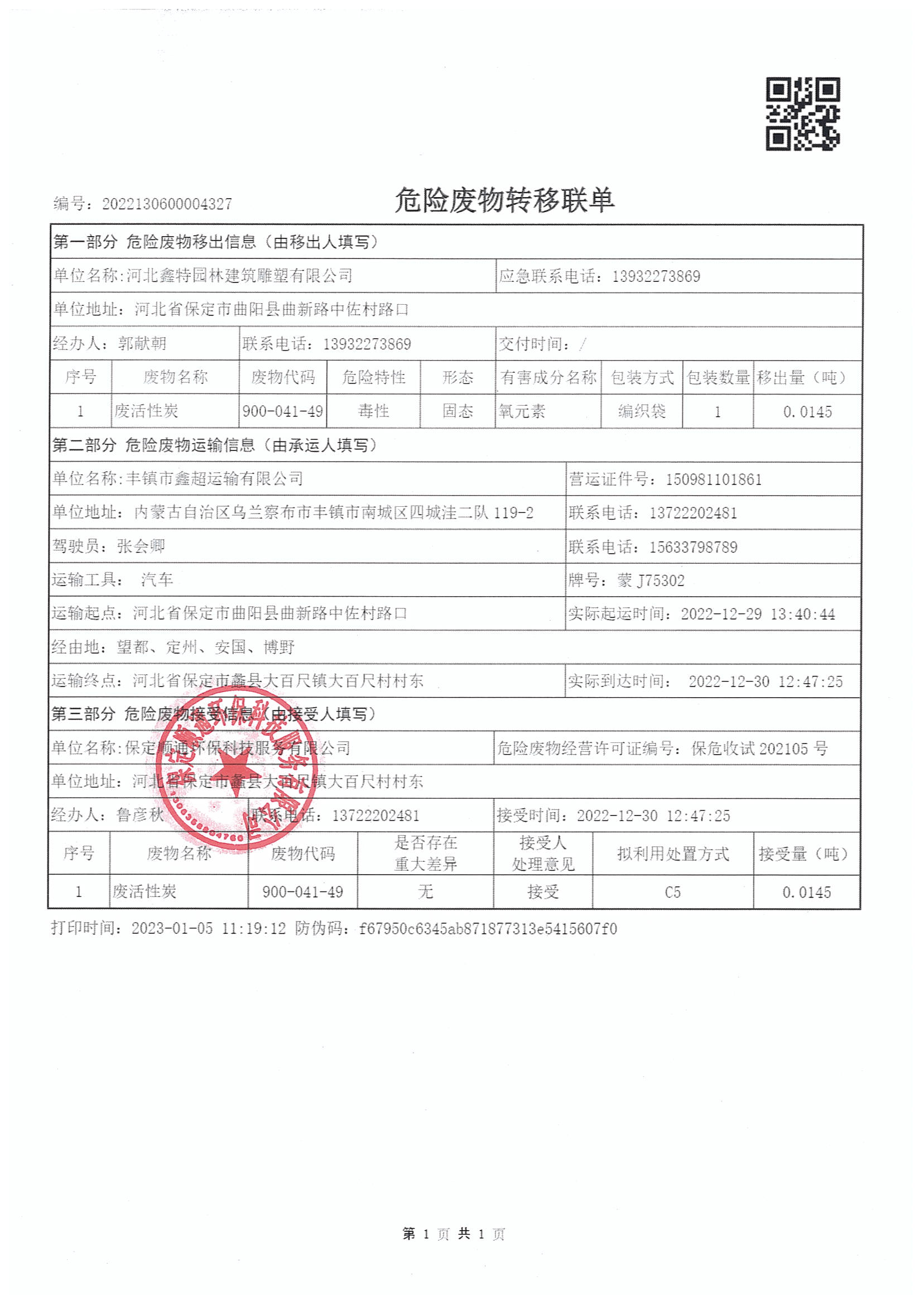 目前公司危废运输时委托有危废运输资质的运输单位,在转移时应督促危险废物运输单位如实填写联单的运输单位栏目,按照国家有关危险物品运输的规定,将危险废物安全运抵联单填写的接受地点。