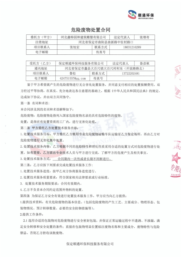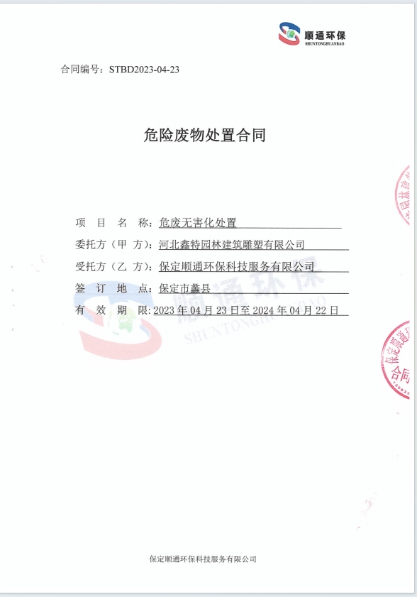 3.依据《北鑫特园林建筑雕塑有限公司事故应急预案》规定,公司每年应举行不少于一次危险废物事故应急演练。针对演练中发现的问题从人员、机械、物料、规章制度和环境等方面进行整改,从而确保在危险废物意外事故发生时,应急预案的有效实施。