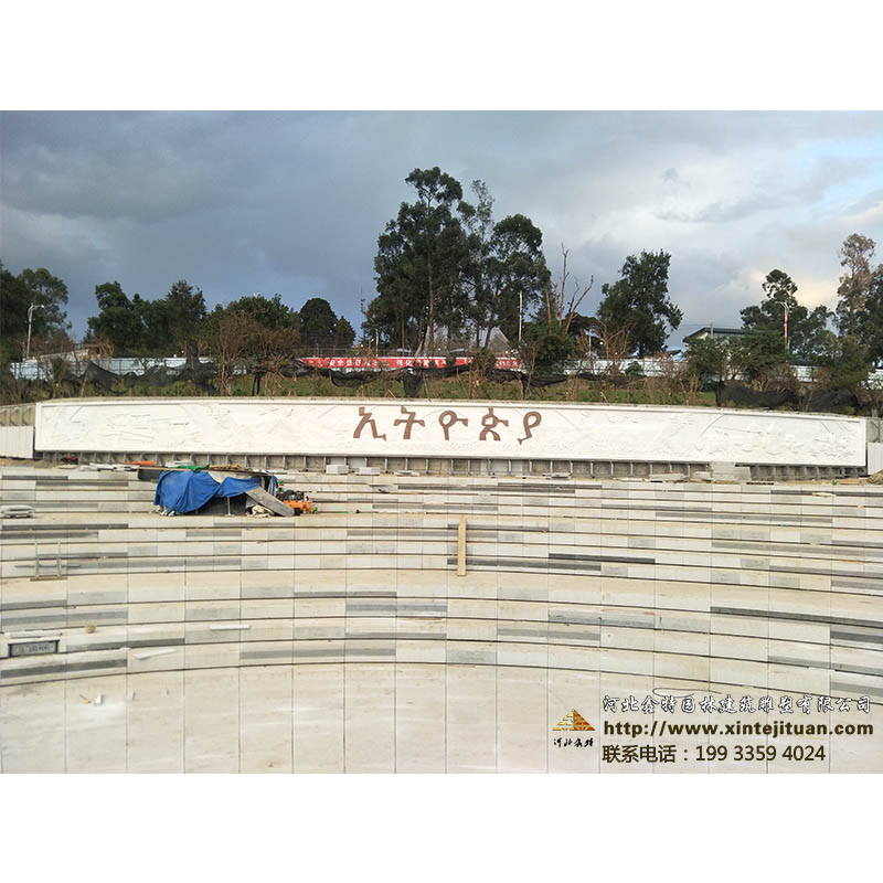 《埃塞赞歌》的浮雕墙采用装饰与写实手法雕刻,前景主要表现埃塞俄比亚最具代表性的植物苔麸、咖啡树、马蹄莲、玫瑰等,中景展现埃塞俄比亚高原、山峰、瀑布、动物、树木等自然风光和乐器、食物容器等人文文化,远景用图案化的方式展现远山、太阳光芒、彩虹及装饰纹样。金色阿姆哈拉语的“埃塞俄比亚”字体,凸显庄重。