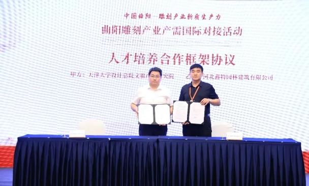 鑫特雕塑集团董事长吴学儒在会议上进行项目路演并与天津大学建筑设计规划研究总院有限公司文化与旅游产业发展研究院签订合作框架协议,标志着双方将在人才培养、产品研发等核心领域紧密携手、深度合作,共同探索雕刻艺术与现代科技、文化旅游的深度融合,为曲阳雕刻产业注入新的活力与创意!